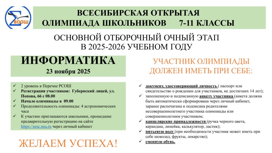 23 ноября 2025 года пройдет отборочный этап Всесибирской открытой олимпиады школьников по информатике для обучающихся 7-11 классов.