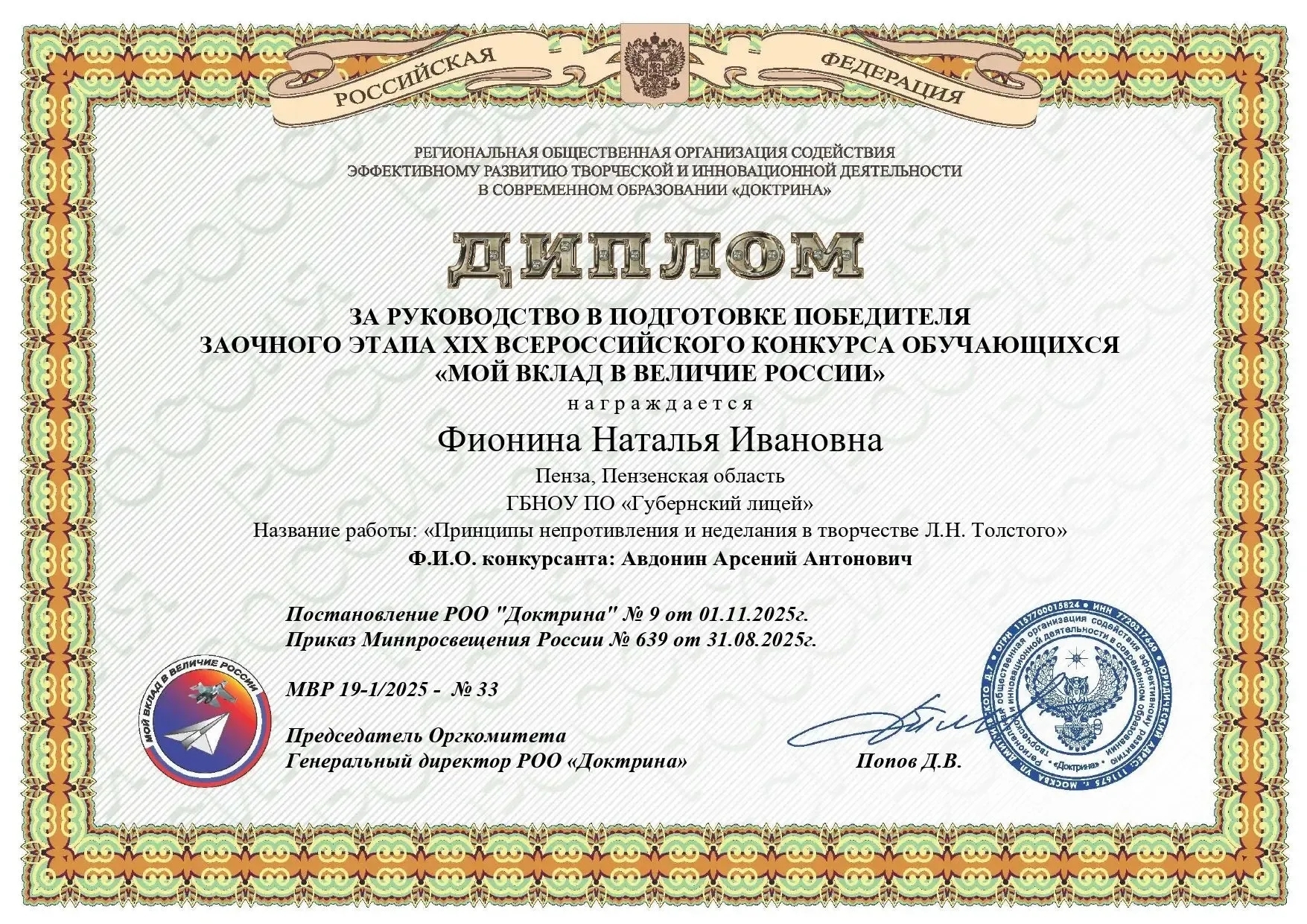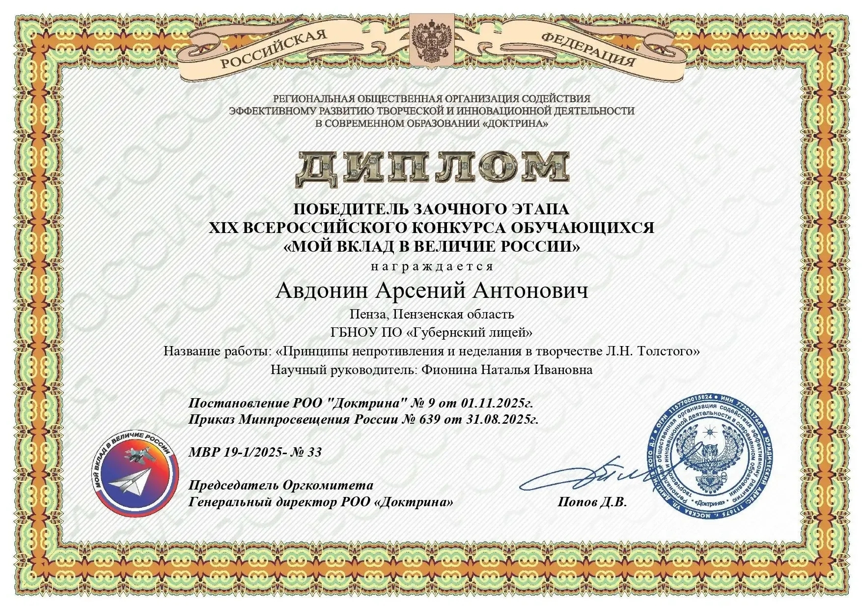 Отличные новости! Обучающиеся Губернского лицея, Арсений Авдонин и Мария Храмова стали победителями заочного этапа XIX Всероссийского конкурса «Мой вклад в величие России».