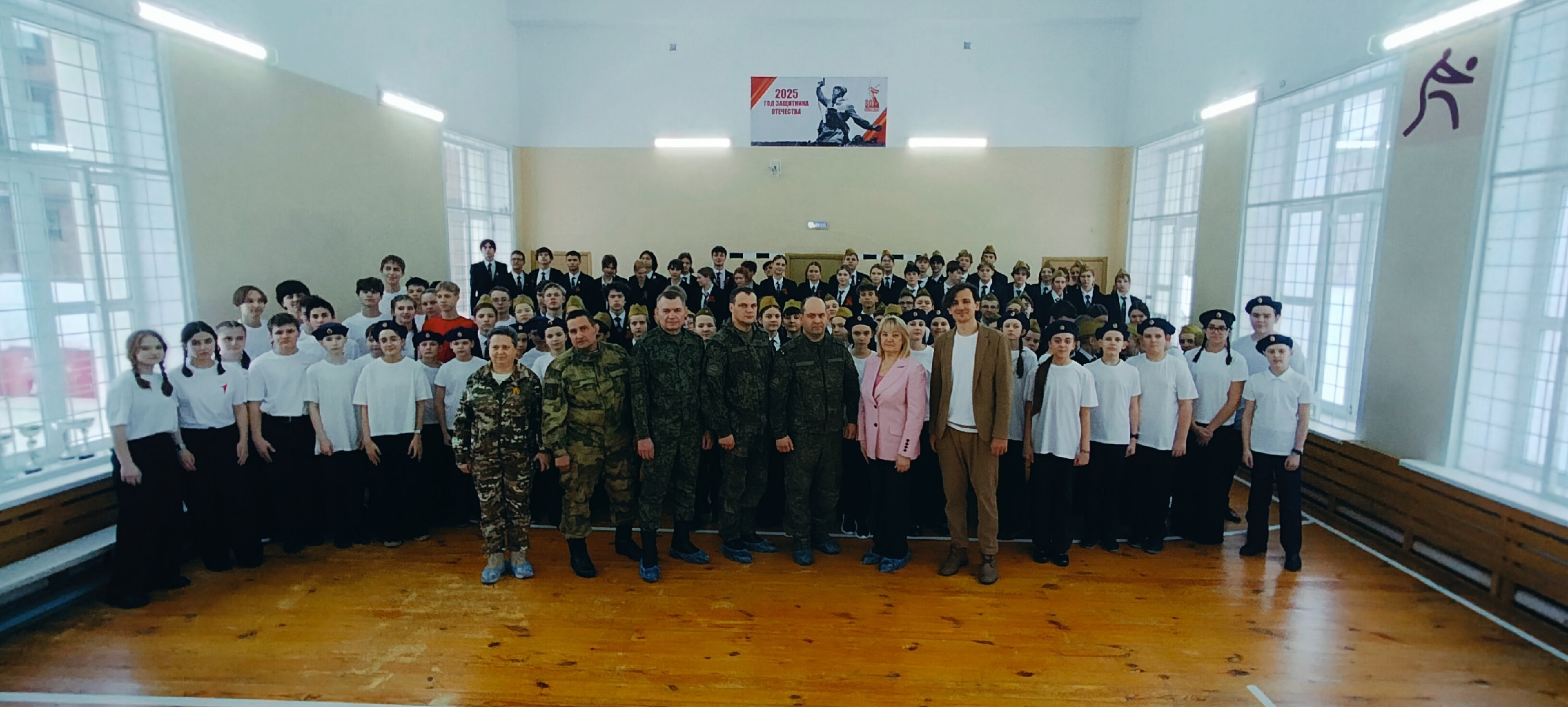 В преддверии Дня защитника Отечества лицеисты, педагоги и почетные гости собрались в спортивном зале, чтобы стать участниками ежегодного военно-патриотического праздника «Смотр строя и песни».